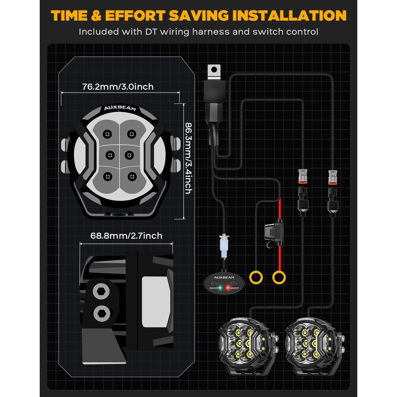 - 【Trustworthy Brand Guarantee】Choose Auxbeam to join a legacy of trusted performance and rugged dependability. 𝐖𝐡𝐚𝐭'𝐬 𝐢𝐧 𝐭𝐡𝐞 𝐛𝐨𝐱 [2* LED off-road lights, 2* black covers, 1* DT wiring harness, 1* mounting kit, 1* user guide, 1* specification, 1* sticker.] 24-month guarantee and 24/7 customer support, we're always here to be your backup.