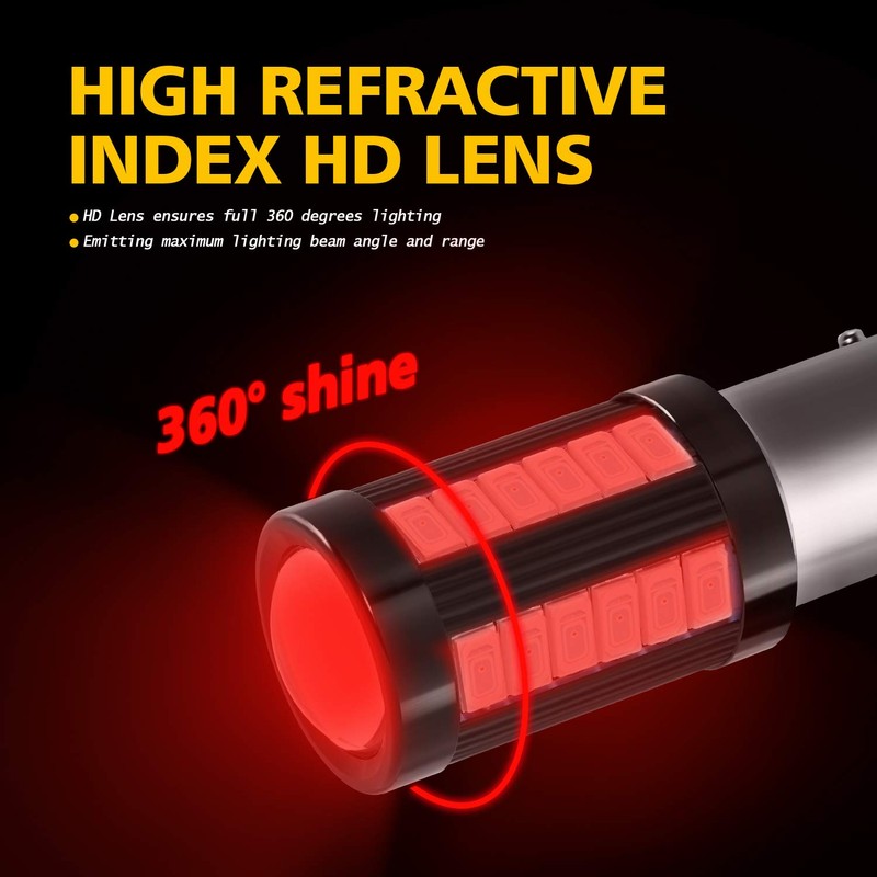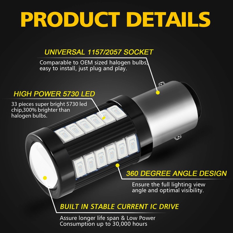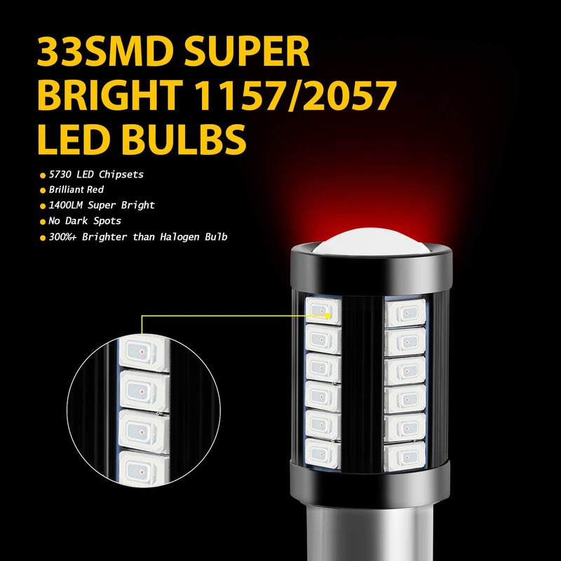 • 3 times Brighter than halogen/stock bulbs: Each 1157 2057 LED bulb comes with high illumination and high quality 33 pieces 5730 LED chips, 360 degrees bright light with HD projector lens increase the brightness and visibility.