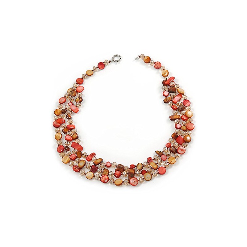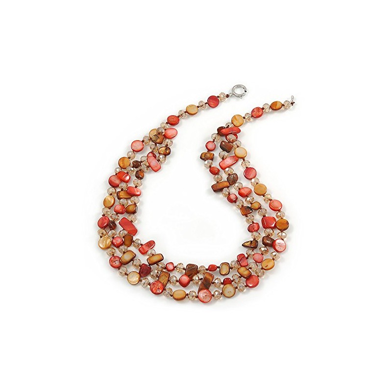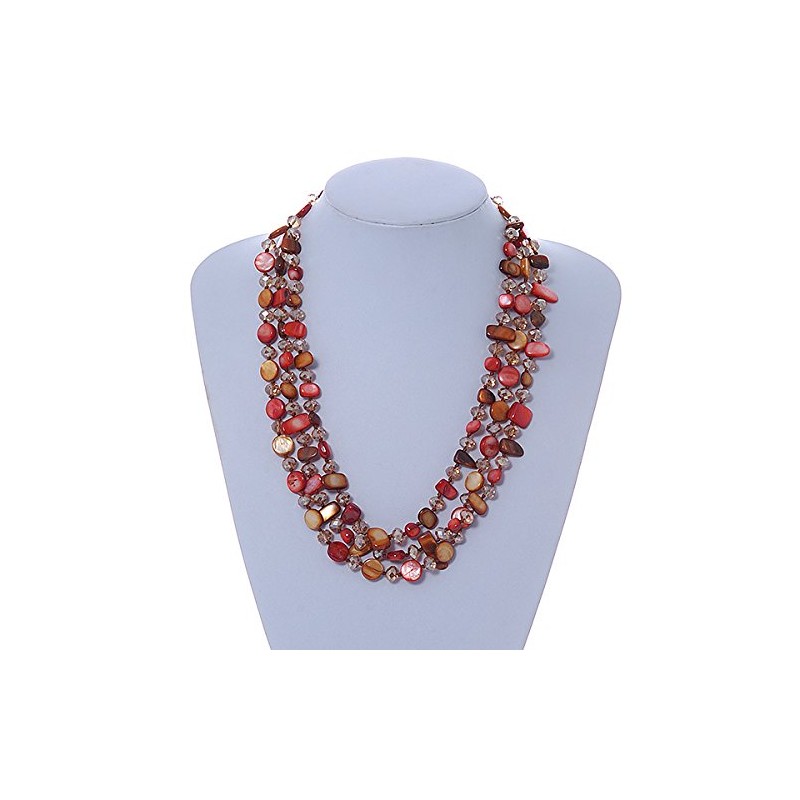 Avalaya 3 Strand Brick Red/Mustard Brown Shell Nugget and Nude Crystal Bead Necklace with Silver Tone Spring Ring Closure - 66cm L