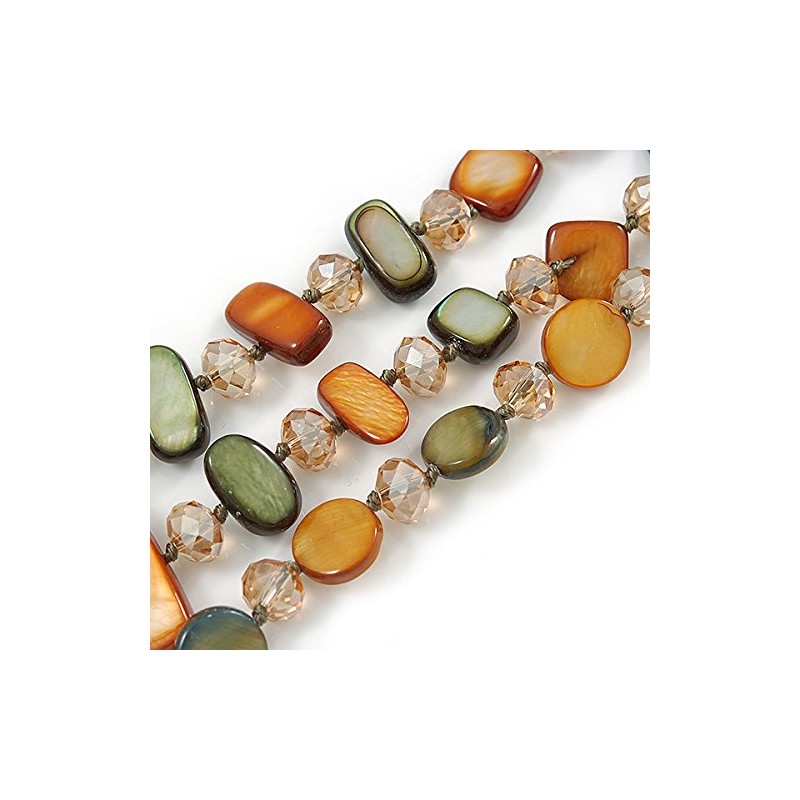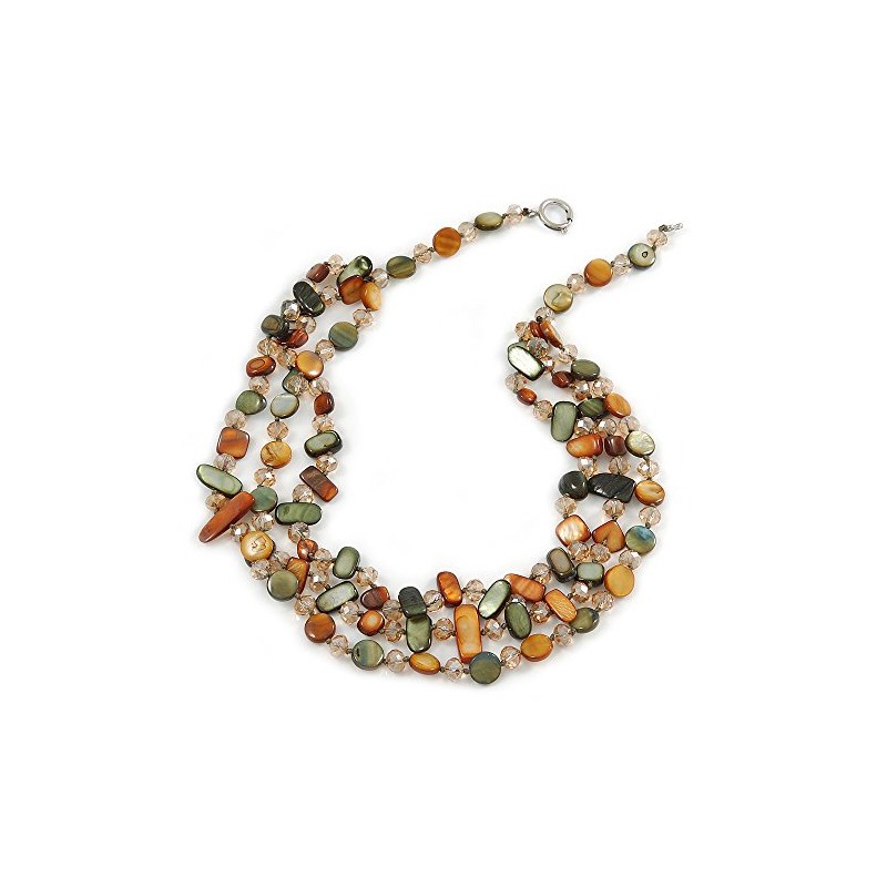 Fashionable flair. You'll shine in this 3 Strand Olive/ Mustard Brown Shell Nugget and Crystal Bead Necklace with Silver Tone Spring Ring Closure. Featuring a 3 strand style necklace, made of shell nuggets and faceted crystal beads in hues of olive and mustard brown. Necklace measures about 52 cm in length, with a 6cm extender, fastens with a silver tone metal lobster claw claps.