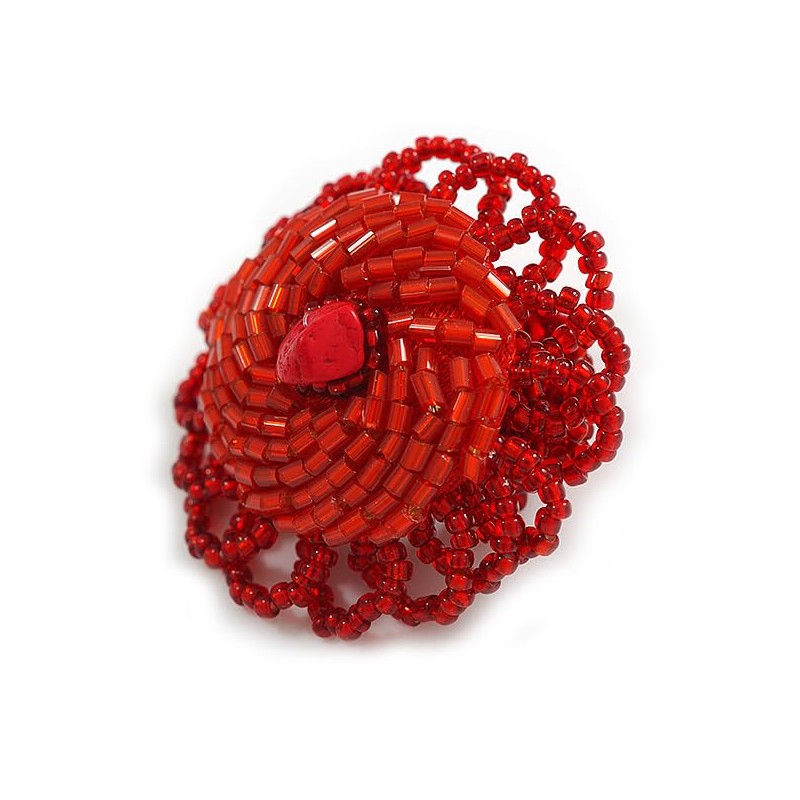 Make a glamorous statement with this unique handmade 40mm Diameter/Scarlet Red Glass Bead Daisy Flower Flex Ring. Featuring a layered daisy flower design, made of glass beads in red shades. The head of the ring measures about 40mm in diameter, and the elasticized band about 15mm in width. Bold and stylish, this cocktail ring is perfect for gorgeous style day or night.