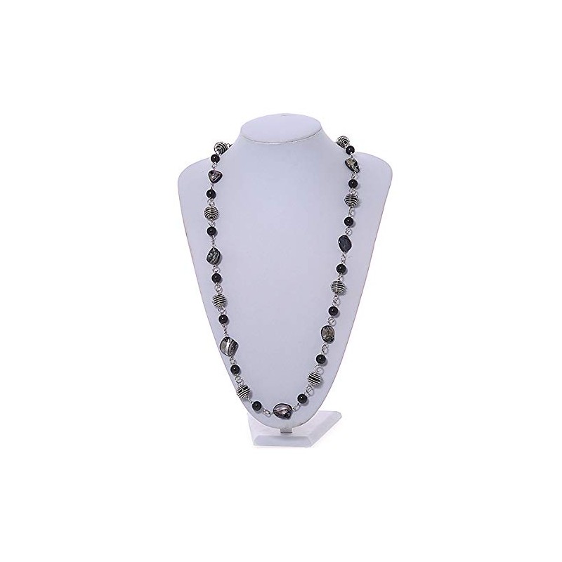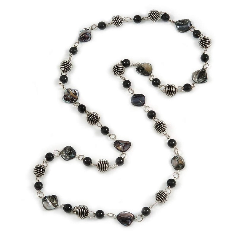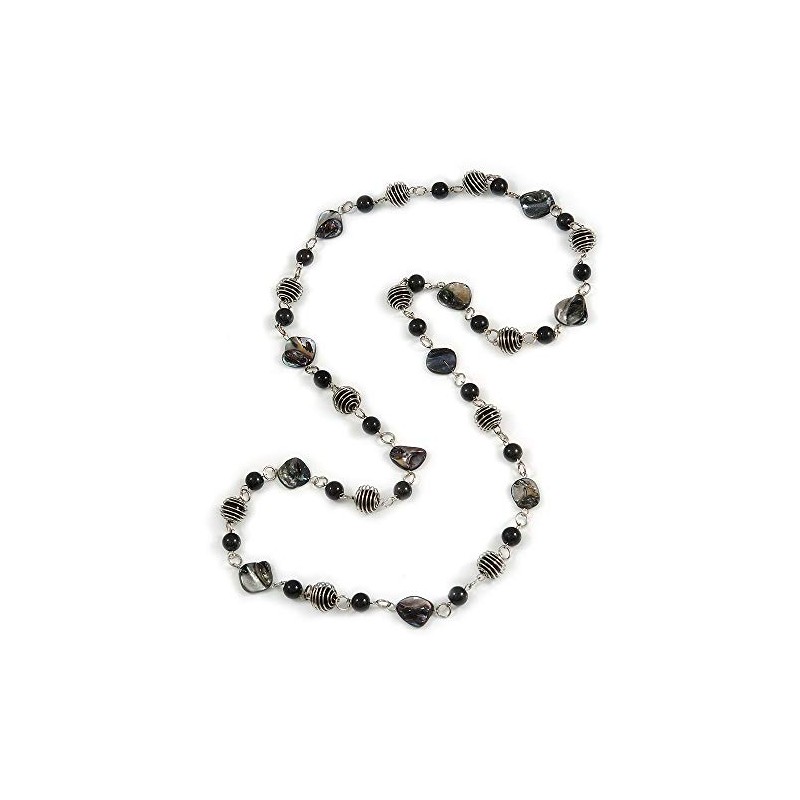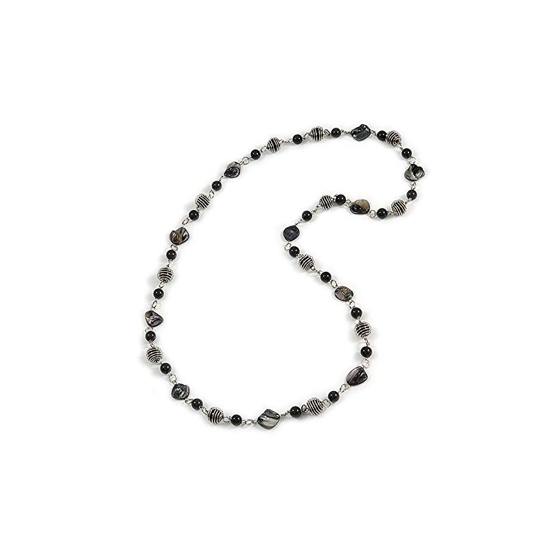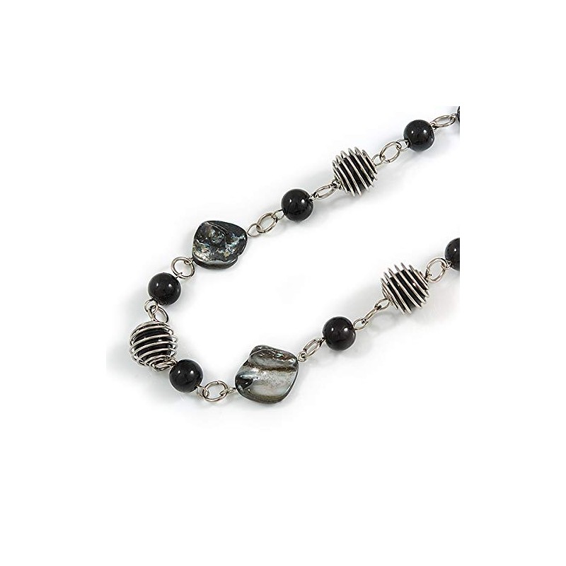 Avalaya Glass and Shell Bead with Silver Tone Metal Wire Element Long Necklace In Black Colours - 120cm L