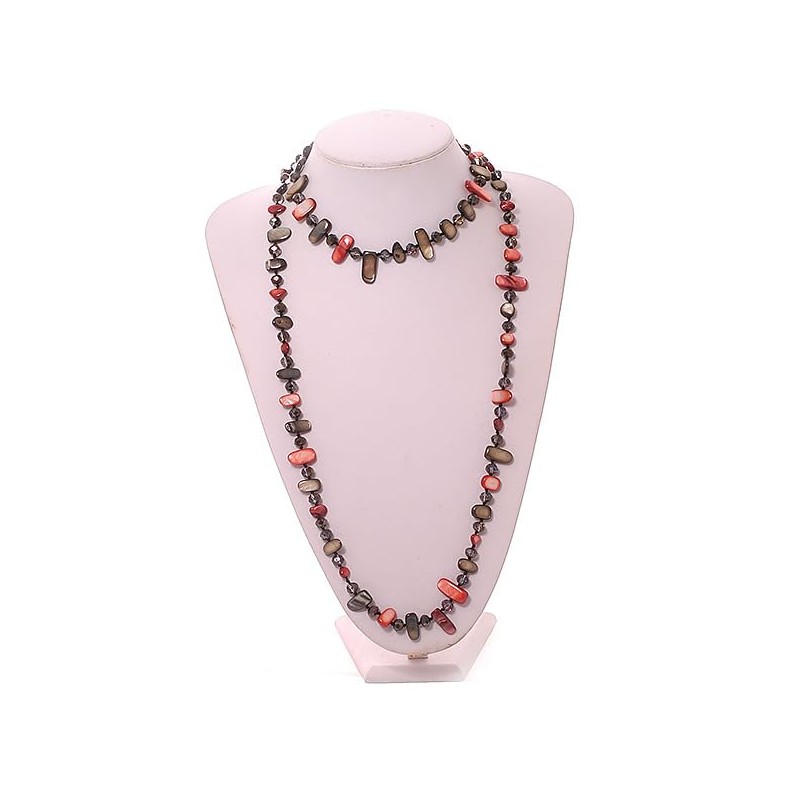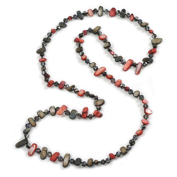 Avalaya Long Shell Nugget and Ash Grey Faceted Glass Bead Necklace in Black/Red - 116cm Long