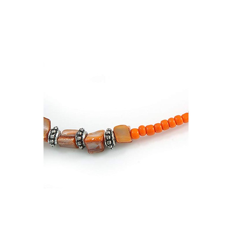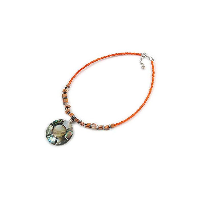 Avalaya Orange Glass Bead Wire Necklace with Shell & Mother of Pearl Medallion In Silver Tone - 50cm L/ 5cm Ext