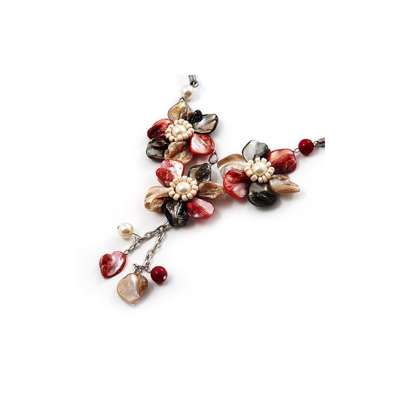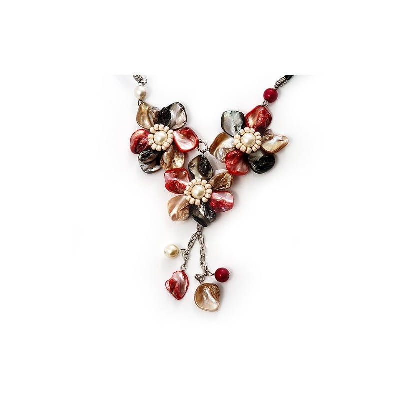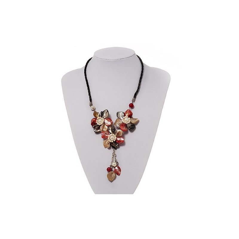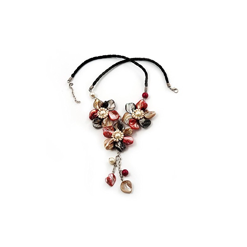 Refresh your look with this stunning Shell-Composite Triple Flower With Tassel Leather Cord Necklace. Featuring 3 joined flowers, made of shell-composite beads in hues of red, antique white and grey. The flowers accented with white pearls and tiny glass beads for a unique look. The front floral station measures about 11cm in width and 15cm in length (including tassel), connected to the braided black leather cord. The necklace measures about 42cm in length, fastens with a silver-tone adjustable lobster-claw clasp (about 4cm extender). Wear this necklace with simple outfits to stand out of the crowd. Pair this shell necklace with a matching bracelet for a complete look.