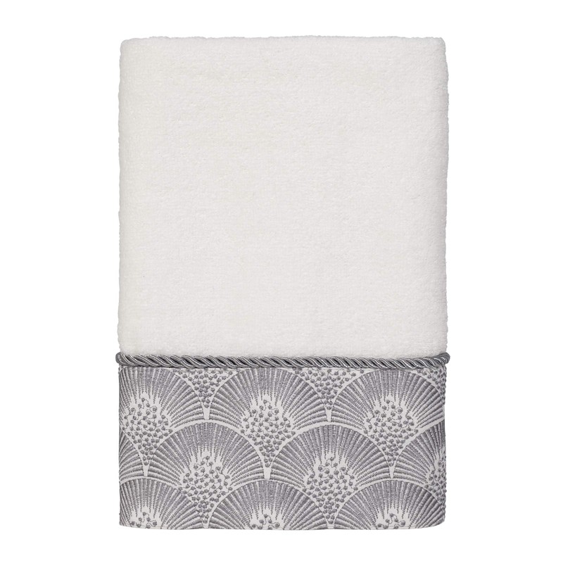 The Avanti Deco Shells Hand Towel features an embroidered band of coordinating silver shells on a tonal fabric attached to a 100% cotton white velour towel. The band is finished with a coordinating rope trim. Imported.