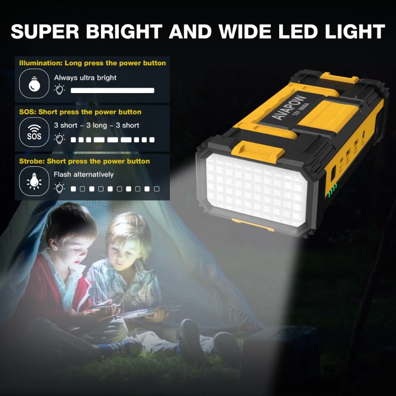 - ULTRA-BRIGHT LED LIGHT - The car battery jump starter is equipped with 3 modes of LED light (Lighting/Flash/SOS), and you can easily convert between lighting modes by switching the power button. The ultra-bright light can help you start your car more conveniently at night, and the strobe and SOS modes can act as a lifeguard in emergency situations.