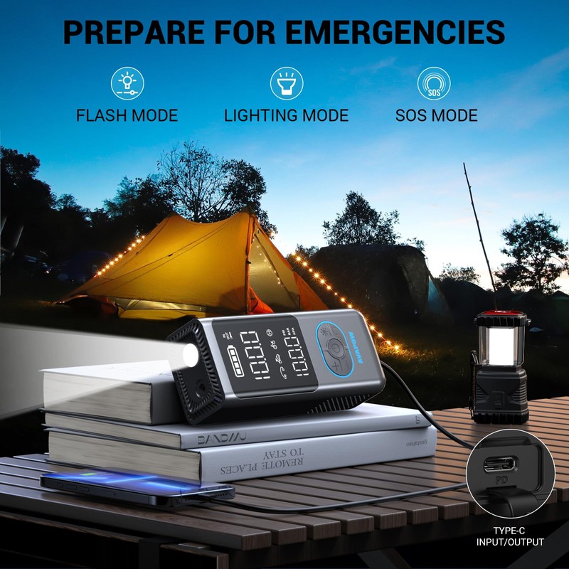 - Emergency Tool & Essential Accessories: More than just an inflator, the AP18 portable air pump features three light modes (flashlight, SOS, strobe) and can charge other smart devices. Lightweight only 1.2 pounds, it comes with a 1x 500mm high-pressure anti-scald hose, 4x inflation nozzles, and a 1x carry-on toolbox, making it the ultimate all-in-one inflation solution.