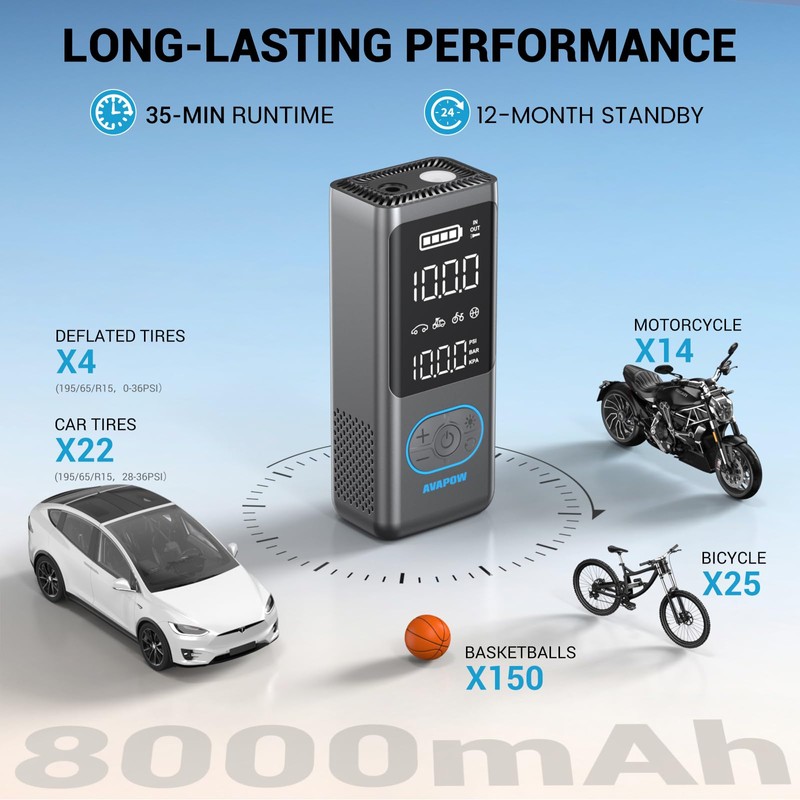 - Long-Lasting 8000mAh Battery for Multiple Inflations: The robust 8000mAh battery delivers up to 35 minutes of runtime, inflating up to 22 tires (195/65/R15, 30-36PSI), 4x deflated car tires, 14x motorcycle tires, 25x bike tires, or 150x basketballs on a single charge. Plus, with a 12-month standby time, it’s always ready to go when you need it!