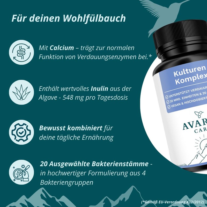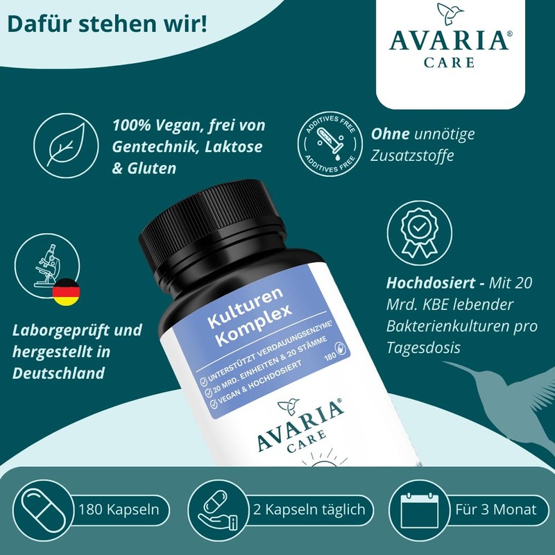Avaria® Care - Culture Complex with 20 Bacterial Strains & 20 Billion CFU, Laboratory Tested & Made in Germany, Vegan, 180 Capsules 90 g