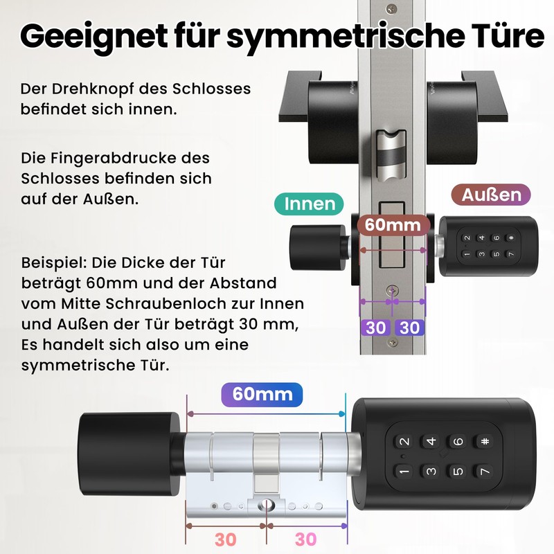 - AVATTO smart door lock suitable for symmetrical and asymmetrical doors: the inner and outer length of the lock cylinder can both be freely adjusted (30 to 45 mm outward and 30 to 45 mm inward), it is suitable for doors with a length of 60 to 90 mm.