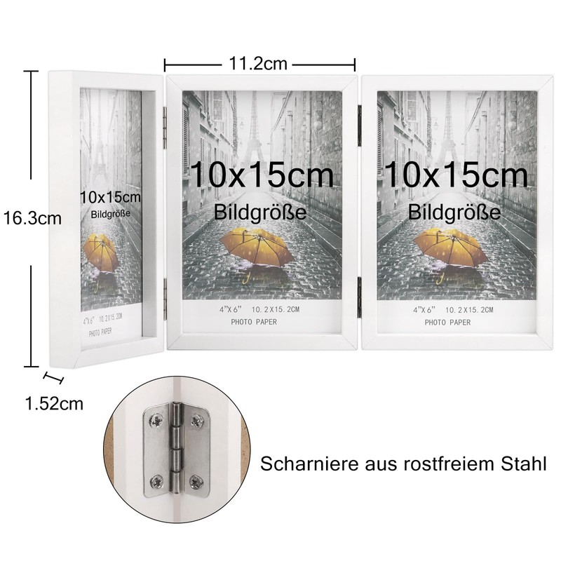 - 3 photo frames: suitable for three 10 x 15 cm photos next to each other in one frame. Connected by stainless steel hinges, can be folded 180°, show the pictures from different angles.