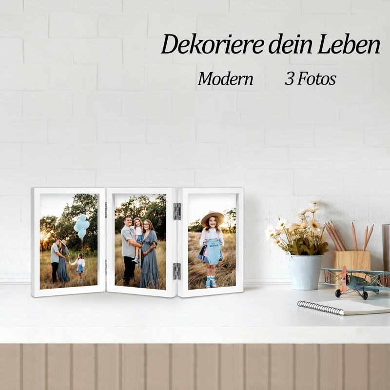 AVEAX Picture Frame for 3 Photos 10 x 15 cm Hinged Wooden Photo Frame with Glass Front White