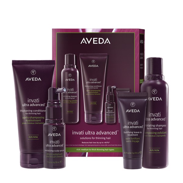 The Aveda Evergreen Invati Ultra Advanced Rich Value Kit is a comprehensive hair care solution designed to revitalize and strengthen your hair. This luxurious kit includes four essential products from Aveda's Invati Ultra Advanced™ line, each formulated to address different aspects of hair health. From exfoliating the scalp to thickening and fortifying each strand, this value kit provides a complete regimen for achieving fuller, healthier hair. Perfect for those looking to combat thinning hair and improve overall hair vitality, the Aveda Evergreen Invati Ultra Advanced Rich Value Kit is your go-to solution for a rich, nourishing hair care experience. What is included in Aveda Evergreen Invati Ultra Advanced Rich Value Kit? • Invati Ultra Advanced™ Exfoliating Shampoo: Rich 200ml • Invati Ultra Advanced™ Thickening Conditioner: Rich 200ml • Invati Ultra Advanced™ Revitalizing Scalp Serum 30ml • Invati Ultra Advanced™ Fortifying Leave-in Treatment 25ml What are the features and benefits of Aveda Evergreen Invati Ultra Advanced Rich Value Kit? Invati Ultra Advanced™ Exfoliating Shampoo: Rich: This shampoo gently exfoliates the scalp, removing build-up and impurities to create a clean and healthy environment for hair growth. Its rich formula nourishes the scalp and hair, leaving it feeling refreshed and revitalized. Invati Ultra Advanced™ Thickening Conditioner: Rich: This conditioner thickens each hair strand from root to tip, providing a fuller appearance. It also strengthens the hair, reducing breakage and promoting overall hair health. Invati Ultra Advanced™ Revitalizing Scalp Serum: This serum invigorates the scalp with a blend of powerful botanicals, promoting a healthy scalp environment and supporting natural hair growth. It helps to reduce hair loss and improve the overall vitality of your hair. Invati Ultra Advanced™ Fortifying Leave-in Treatment: This leave-in treatment fortifies and protects hair from damage while adding volume and thickness. It provides long-lasting nourishment and helps to maintain the health and strength of your hair throughout the day. Who is Aveda Evergreen Invati Ultra Advanced Rich Value Kit for? This kit is perfect for individuals looking to combat thinning hair and improve overall hair vitality.