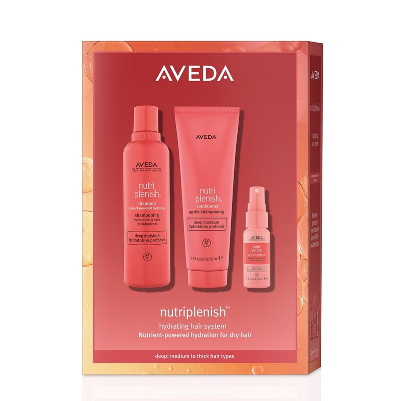 The Aveda Evergreen Nutriplenish Deep Value Kit is a comprehensive hair care bundle designed to deeply nourish and hydrate your hair. This exclusive kit from Aveda includes three essential products that work together to provide intense moisture and care for your hair. The Nutriplenish™ Shampoo Deep Moisture cleanses while infusing your hair with rich hydration, the Nutriplenish™ Conditioner Deep Moisture provides deep conditioning to leave your hair soft and manageable, and the Nutriplenish™ Leave In Conditioner offers lightweight, long-lasting moisture and protection. Perfect for those with dry or dehydrated hair, this kit ensures your hair looks and feels its best. What is included in Aveda Evergreen Nutriplenish Deep Value Kit? • Nutriplenish™ Shampoo Deep Moisture 250ml • Nutriplenish™ Conditioner Deep Moisture 250ml • Nutriplenish™ Leave In Conditioner 30ml What are the features and benefits of Aveda Evergreen Nutriplenish Deep Value Kit? Nutriplenish™ Shampoo Deep Moisture: This shampoo is formulated with a rich blend of nutrients and superfoods to deeply cleanse and hydrate your hair. It helps to replenish moisture, leaving your hair feeling soft, smooth, and healthy. Nutriplenish™ Conditioner Deep Moisture: This conditioner provides intense hydration and nourishment to your hair. It helps to detangle and smooth your hair, making it more manageable and reducing frizz. The deep moisture formula ensures your hair stays hydrated throughout the day. Nutriplenish™ Leave In Conditioner: This lightweight leave-in conditioner offers long-lasting moisture and protection for your hair. It helps to detangle and protect your hair from heat styling and environmental damage, leaving it soft, shiny, and healthy-looking. Who is Aveda Evergreen Nutriplenish Deep Value Kit for? This kit is perfect for anyone with dry or dehydrated hair looking for a comprehensive solution to deeply nourish and hydrate their hair.