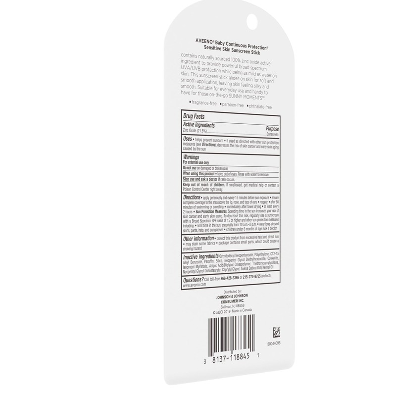 - 0.47-ounce stick of Aveeno Baby Continuous Protection Sensitive Skin Mineral Sunscreen Stick with Broad Spectrum SPF 50 in a convenient, travel size for on-the-go broad spectrum protection from harmful UVA and UVB rays for your little one's skin