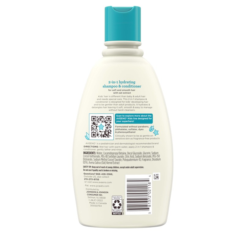 Gently clean, condition, and detangle your child's hair with Aveeno Kids 2-in-1 Hydrating Shampoo & Conditioner. Designed for kids' developing hair and sensitive skin and is formulated to be more gentle than adult products. This shampoo and conditioner hydrates, detangles hair, and helps remove knots, leaving it soft, smooth, and easy to manage. Formulated with oat extract, the hydrating 2-in-1 shampoo and conditioner is tear-free and has a mild scent clinically shown to be as gentle on sensitive skin as fragrance-free products. The hypoallergenic kids shampoo and conditioner from a pediatrician- and dermatologist recommended brand is formulated without phthalates, sulfates, dyes, and phenoxyethanol. Aveeno Kids 2-in-1 Hydrating Shampoo & Conditioner makes a great addition to your kids' daily hair care routine. To use, wet hair with warm water, apply to wet hair, gently lather, and rinse.