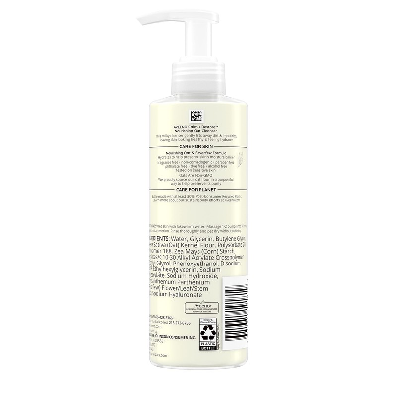 Aveeno Calm + Restore Daily Hydrating Facial Cleanser for Sensitive Skin with nourishing oat and calming feverfew that gently cleanses and hydrates skin. The ideal daily facial cleanser for dry skin, this gentle milky cleanser lifts away dirt and impurities, while leaving the skin looking healthy and feeling smooth. Aveeno Calm + Restore suitable for sensitive skin with nourishing oat goes beyond soothing and restores the skin’s moisture barrier. The non-comedogenic and hypoallergenic formula of this gentle face cleanser for dry skin has been tested on sensitive skin and is free from fragrances, parabens, alcohol, dyes, and phthalates. From a dermatologist-recommended brand for over 70 years, Aveeno Calm + Restore comes in a bottle made with at least 30% Post-Consumer Recycled plastic. Use morning and night as a part of your daily skincare routine by massaging in 1-2 pumps onto wet skin in a circular motion. Rinse and pat dry.