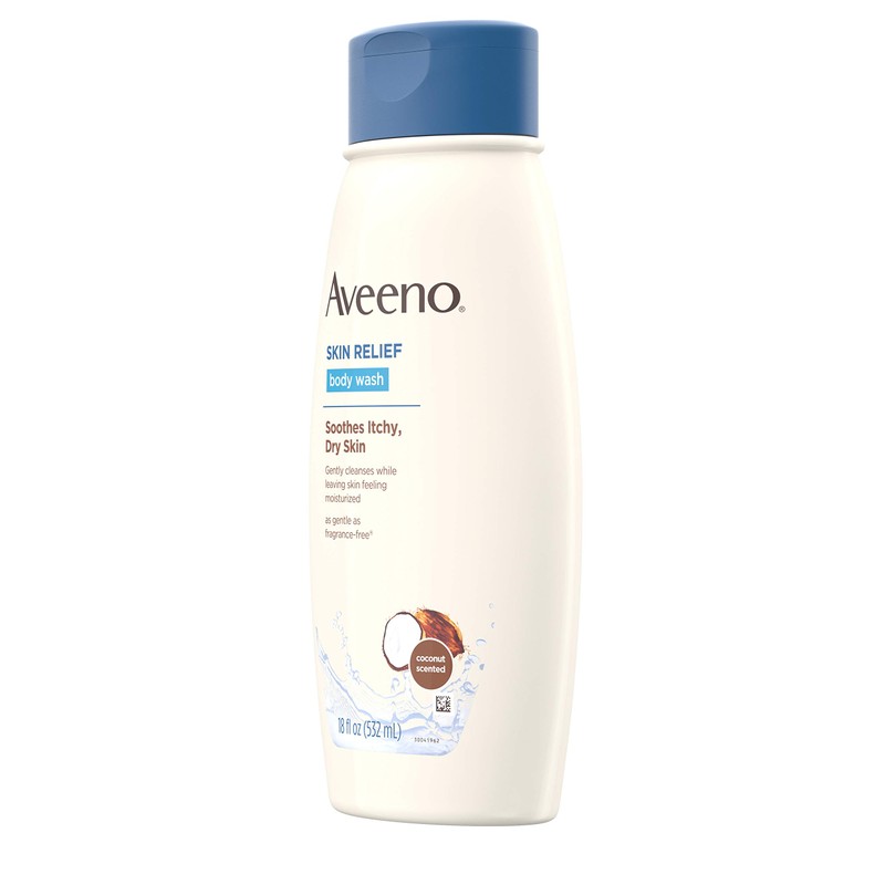 - 18-fluid ounce bottle of Aveeno Skin Relief Body Wash with Coconut Scent gently cleanses while removing dirt, oil and bacteria and provides effective relief of dry, itchy skin