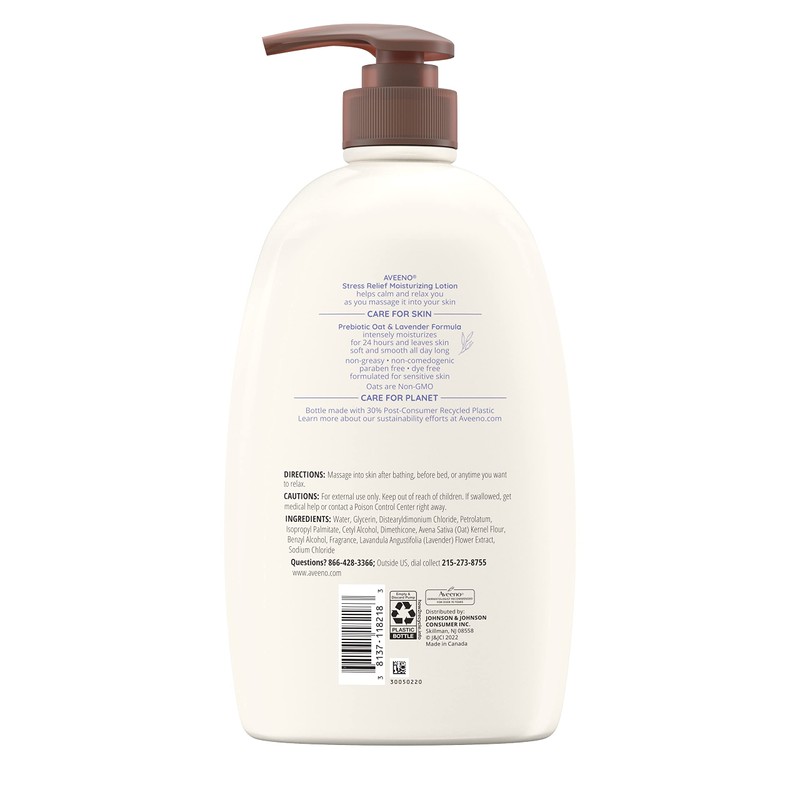 Aveeno Stress Relief Moisturizing Body Lotion with lavender scent & prebiotic oat helps calm and relax you as you massage into your skin moisturizing for a full 24 hours to leave skin soft & smooth. Using the goodness of nature and the power of science, this soothing daily body moisturizer is made with prebiotic oat and intensely hydrates skin, leaving it feeling soft and smooth. It also combines the calming scent of lavender and prebiotic oat to help calm and relax you as you massage it into your skin to help you unwind. This lavender scented lotion for dry skin has a nourishing non-greasy formula that absorbs quickly for lasting moisture throughout the day. This non-comedogenic moisturizer is paraben free, dye free, & gentle to the skin. Massage this lavender scented body lotion onto to lock in moisture & to leave skin feeling soft & smooth. From Aveeno, a dermatologist-recommended brand for over 70 years. This bottle is made with 30% Post-Consumer Recycled Plastic.