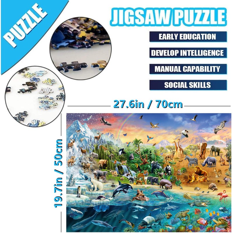• 27.56 x 19.69 Inch Finished Size: This Animal World puzzle manufactured by advanced premium printing technology. Each puzzle piece is cut in a unique shape to provide an extra level of self check and concentration, can effectively inspire people's thinking, train their thinking, judgment and patience.