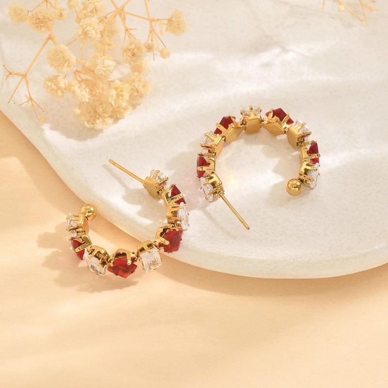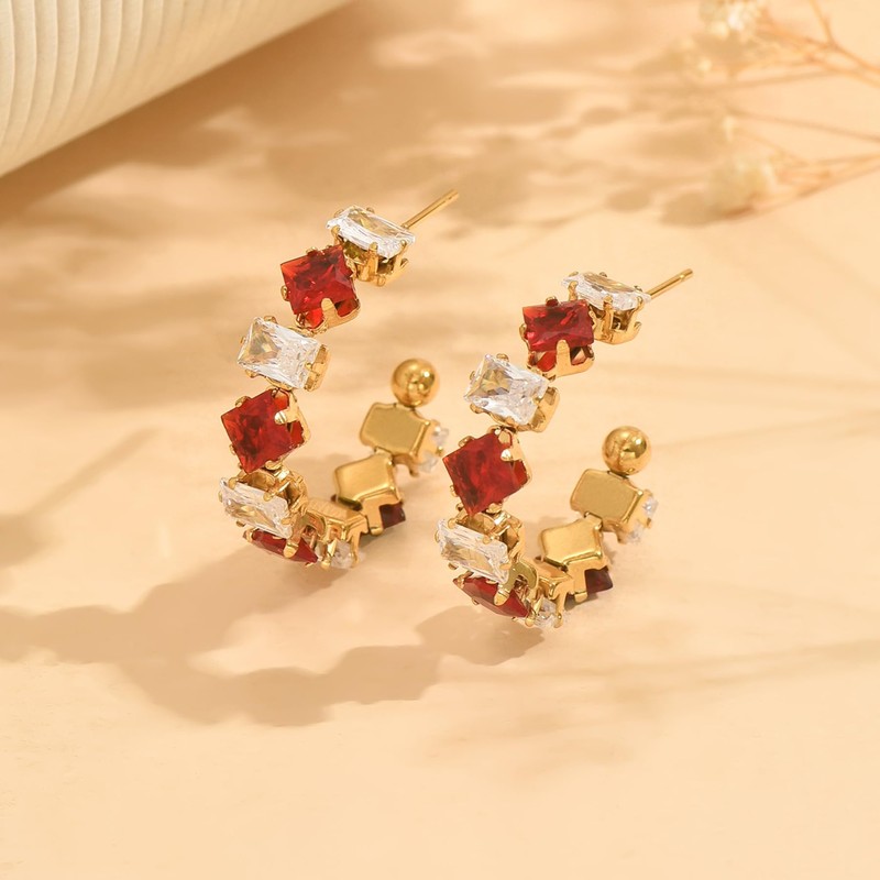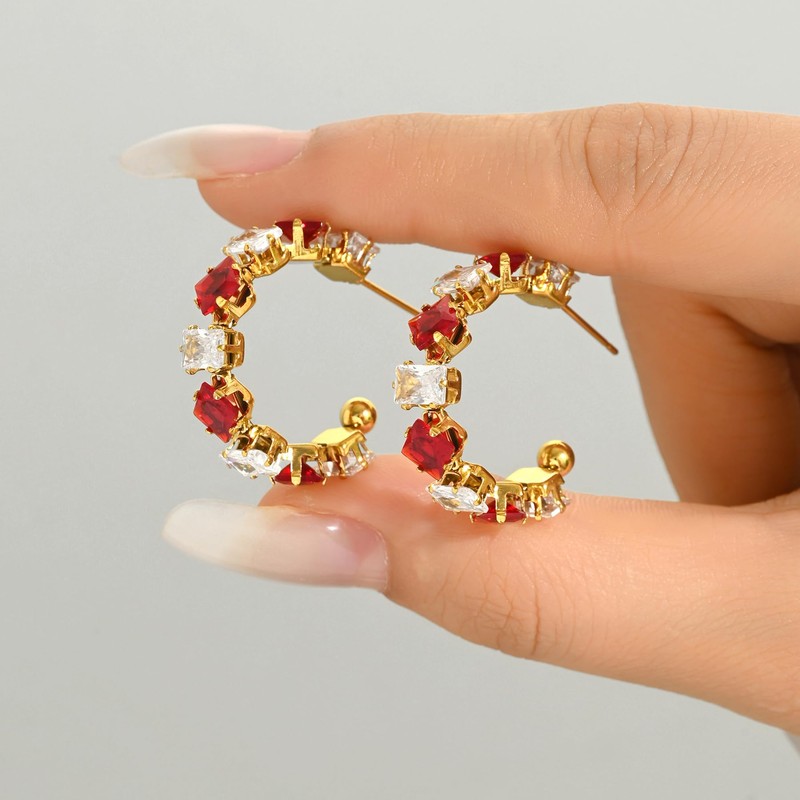 AVEKENY Gold CZ Stud Earrings for Women 18K Gold Plated Dainty Green Red Purple Rectangle Cubic Zirconia Stainless Steel C Shape Open Half Huggie Hoop Earring Hypoallergenic Trendy Lightweight Birthstone Jewelry