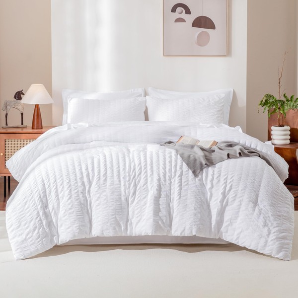 AveLom Queen Bed in a Bag 7 Pieces White Seersucker Comforter Set, All Season Washed Microfiber Lightweight Bedding Sets for Bedroom with Comforters, Sheets, Pillowcases & Shams