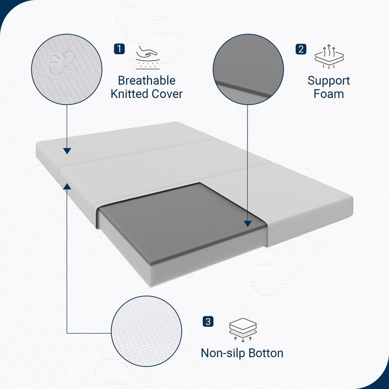 - 【Removable & Non-Slip】This queen folding bed topper features a smooth center zipper that makes the cover easy to remove and machine wash. The non-slip bottom fabric keeps the mattress firmly in place on the floor, preventing unwanted movement and ensuring stable, comfortable use at all times.