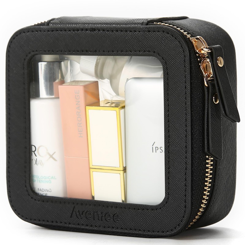- ❤【LUXURY DESIGN】Unlike other flimsy clear makeup bags, our mini cosmetic case(measuring 5.1’ x 4.8’ x 2.35’) which made of premium saffiano PU leather and thick vinyl can keep a good structure and. The small cosmetic bag was designed into a minimalist boxy shape, crafted in beautiful PU leather and finished with polished hardware. Together with the beautiful stitches and whisper-quiet metal zippers, it’s durable for long-lasting use.