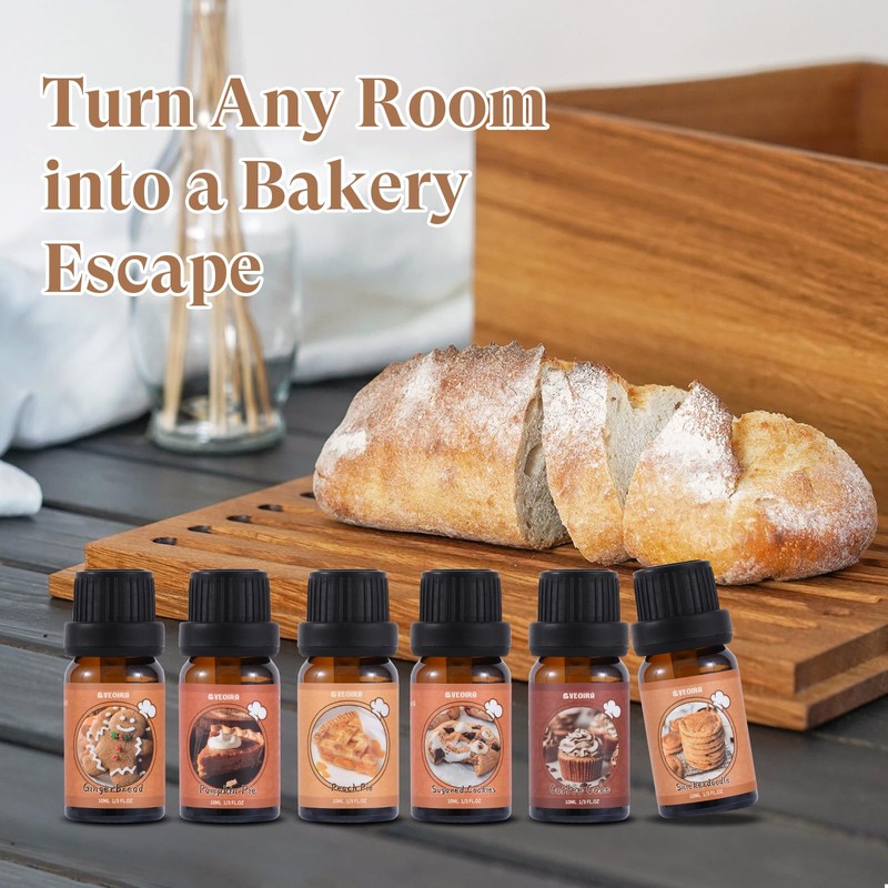 • A Symphony of Baked Bliss: Picture your space transforming into a cozy bakery by 6x10ml bakery essential oils set: Peach Pie, Pumpkin Pie, Snickerdoodle, Coffee Cake, Sugared Cookies, Gingerbread diffuser oil. Each whiff feels like stealing a bite from Grandma's secret recipe-minus the calorie guilt.
