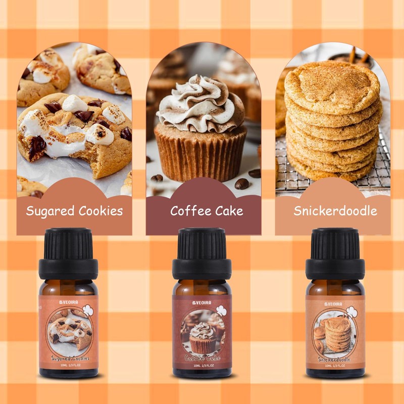 AVEOIRA AVEOIRA Bakery Fragrance Oils Set, Sweet Essential Oil Set for Diffuser, Candle, Soap Making Scented Oils, Peach Pie, Pumpkin Pie, Snickerdoodle, Coffee Cake, Sugared Cookies, Gingerbread, 6x10ml
