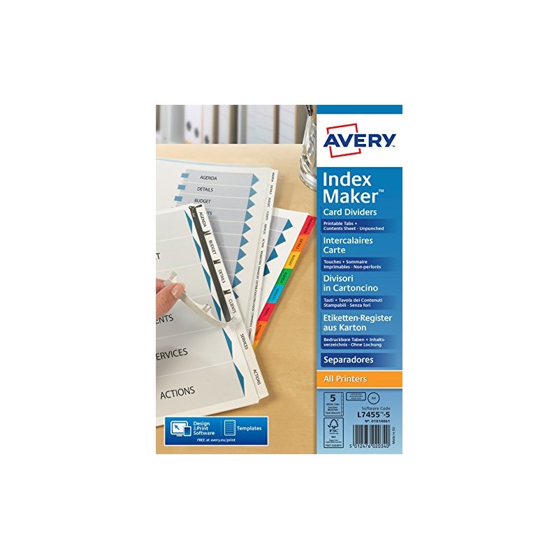 Avery 01814061 A4 IndexMaker Unpunched Dividers with Printable Tabs, 5 Part Dividers - White