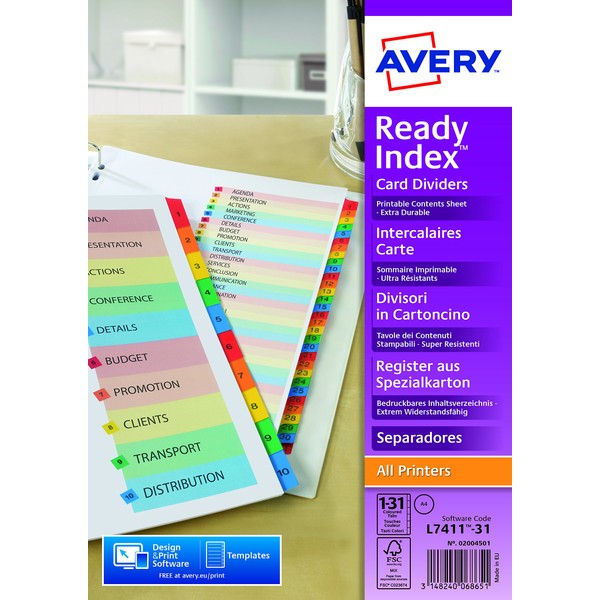 Avery 02004501 200 GSM A4 Pre-Printed Dividers, Multicoloured Tabs 1-31