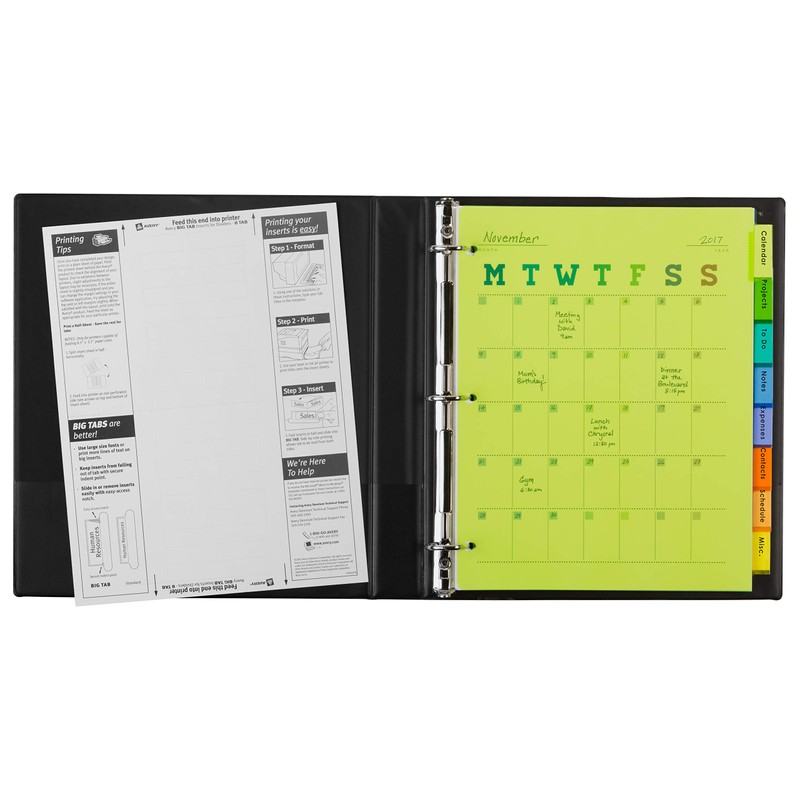 Sometimes good things do come in big packages. Big TabTM Insertable Plastic Dividers offer extra convenience for your binder or notebook. The larger style insertable tabs accommodate inserts that you can print with sizeable fonts or more lines of text than on a typical insert for even more eye-catching power. Use free templates from Avery Design & Print to create professional-looking tabs. An easy-access notch at the top of the tab lets you slide inserts in and out with ease, while a secure indent point at the base of the tab keeps your insert from falling out. Translucent plastic offers a durable solution, so you can enjoy long-lasting organization of all your big ideas.