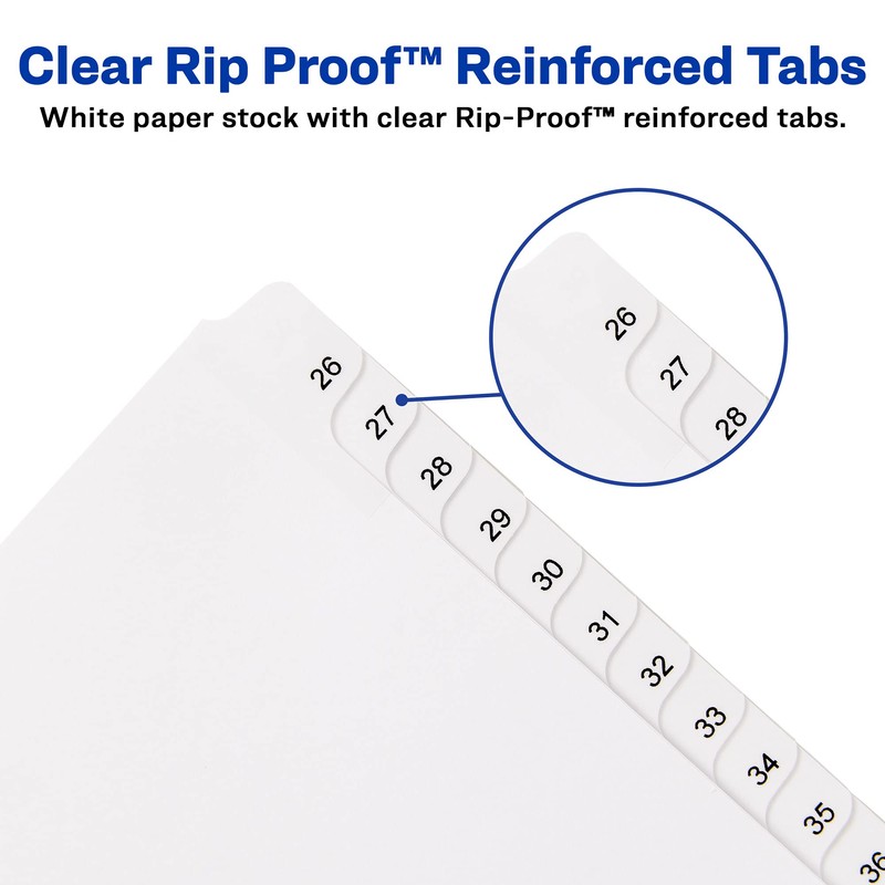 Quickly sort piles of legal documents and notes numerically with this 5-pack of Avery 21702 26-50 legal exhibit dividers with Allstate-style design. Printed in numerical order with one number per tab, each tab is also printed on both sides for better visibility as you flip through your documents. The font of each tab is printed to match the Allstate style with Helvetica regular type. Avery dividers feature tabs reinforced with clear Rip Proof technology that ensures that the tabs can survive everyday wear and tear. Unpunched for universal compatibility, the binding edge is left intact so that they can be hole-punched to fit with any binding system. 5 packs of 25 dividers are included for a total of 125 dividers. Whether you are an office admin maintaining a system of records, an attorney keeping track of notes or a paralegal organizing vital documents, Avery dividers are the perfect way to organize your life in style.