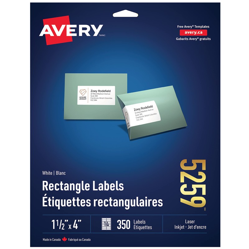 Avery Address Labels for Laser Printers, 1-1/2" x 4", White, Rectangle, 350 Labels, Permanent (5259) Made in Canada