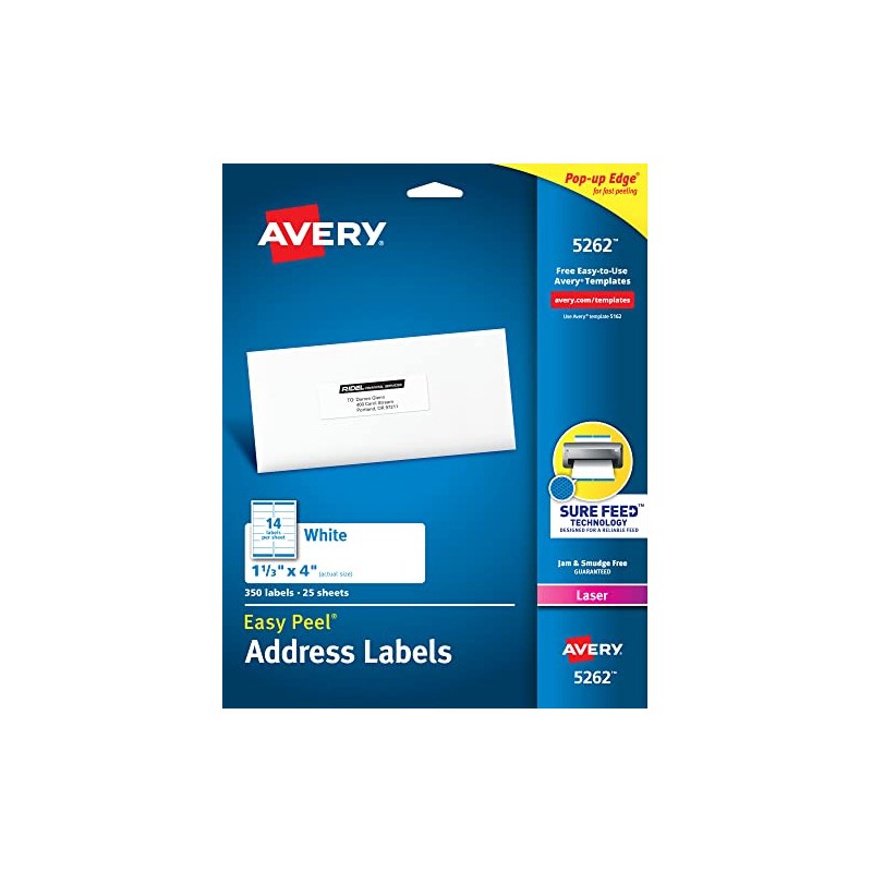 Avery Address Labels with Sure Feed for Laser Printers, 1-1/3" x 4", 350 Labels, Permanent Adhesive (5262), White
