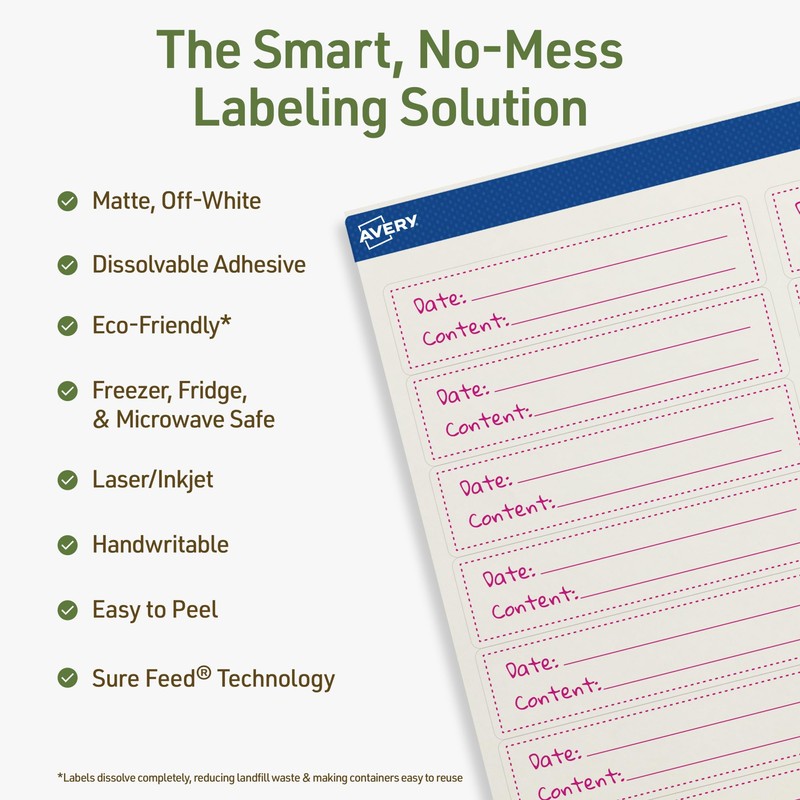 Avery Dissolvable Rectangle Labels, Sure Feed Technology, 1" x 4", Matte White, Laser/Inkjet Printable, 500 Labels Total, Freezer-Safe, Microwave-Safe, Refrigerator-Safe