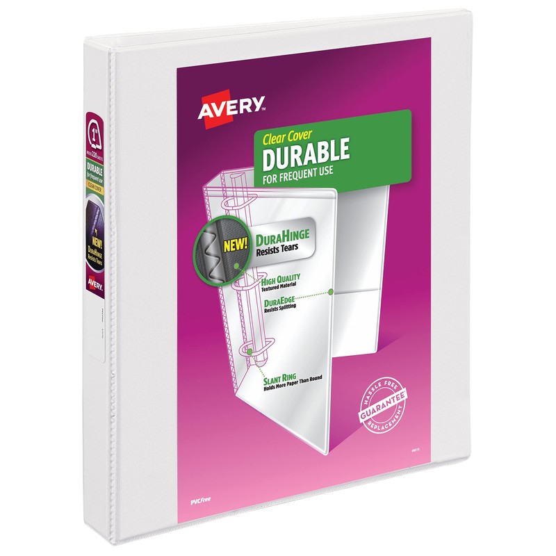 Designed with toughness and durability in mind, the Avery Durable View 1 inch binder stands strong where many basic binders fall apart. Its sturdy exterior features a tear-resistant spine (DuraHinge) and more flexible, split-resistant edges (DuraEdge). Durable binders are also fully adhered with a deep-weave polypropylene cover that is resistant to bubbling, surface wrinkles, and is tear-resistant. Great for frequent use. 1 inch 3 ring Durable View binder is great for use as a set to organize home paperwork, important documents, tax papers, classroom projects or to organize information for multiple meeting attendees Customize your view binder spine, front and back covers with hundreds of free binder templates and designs at avery.com/templates Slant rings and two interior pockets. 3 ring binder holds up to 220 sheets. Plenty of room to hold lots of paper! Two interior pockets also help to keep loose papers secure Durable view binder allows for customization on spine, front and back covers Greener choice - contains 42% postconsumer recycled content. UL Claim Validation - UL environmental claim validations lend third-party credibility to single-attribute environmental claims.
