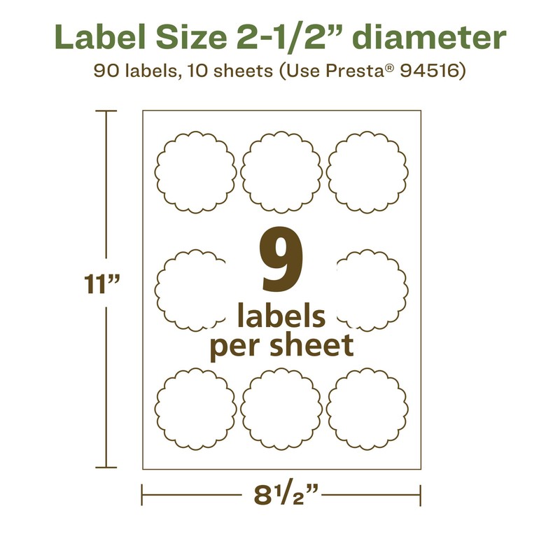 Avery EcoFriendly Matte White Recycled Round Scalloped Labels, 2.5" Diameter, Print-to-The-Edge, Matte White Labels, Permanent Label Adhesive, Laser/Inkjet, 90 Printable Labels