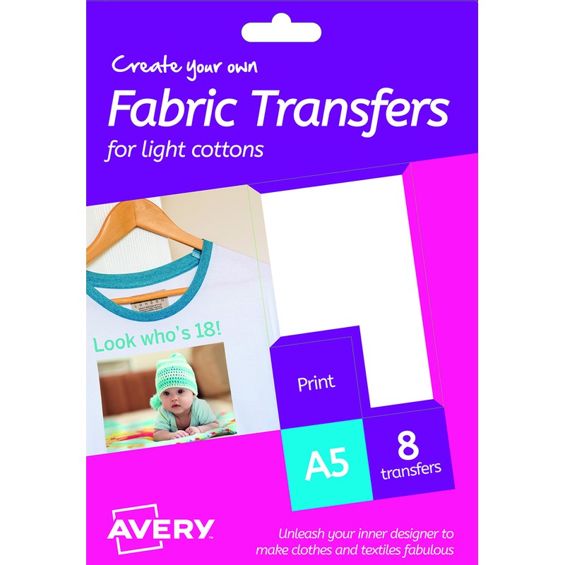 Create original clothing and fabric designs to set you apart from the crowd with Avery fabric transfers. Ideal for clothing and textile decoration, these high quality, easy to use iron-on transfers are ideal for parties, seasonal celebrations, great for gifts and company events to give your clothing a personalised look. Use with light coloured, cotton fabrics such as T-shirts, sweatshirts, baby clothes, aprons, bags, tea towels and cushion covers. Avery transfer sheets feed easily through most inkjet printers and the crisp printed image stays bright even after washing. Available in 148 x 210 mm size sheets in handy A5 packs.