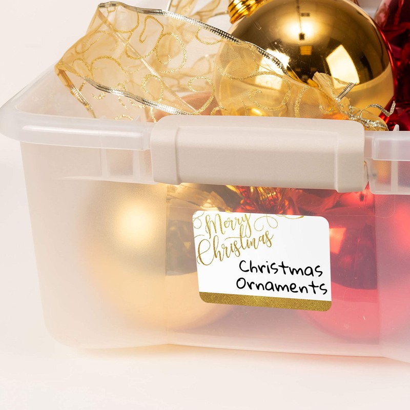 - The tags feature an elegant "Merry Christmas" written in gold script with a gold border accent on the bottom of the tag. They're the perfect holiday stickers for parties, work events, social mixers and more.