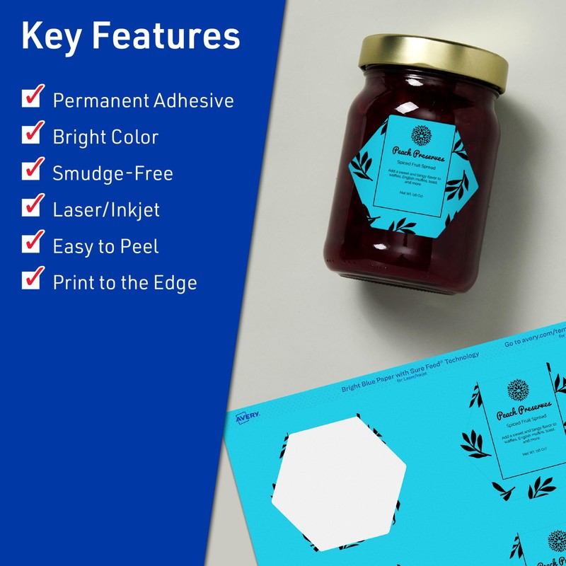 Avery Printable Hexagon Labels with Sure Feed Technology, 2-1/2" x 2-57/64", Bright Blue Labels, Print-to-The-Edge, Laser/Inkjet, 120 Total, Great for Cosmetic Labels and Jar Labels