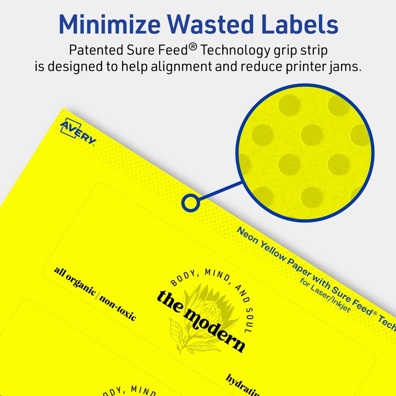 • Avery labels with patented Sure Feed technology provide a more reliable feed through your printer, reducing misalignments and jams