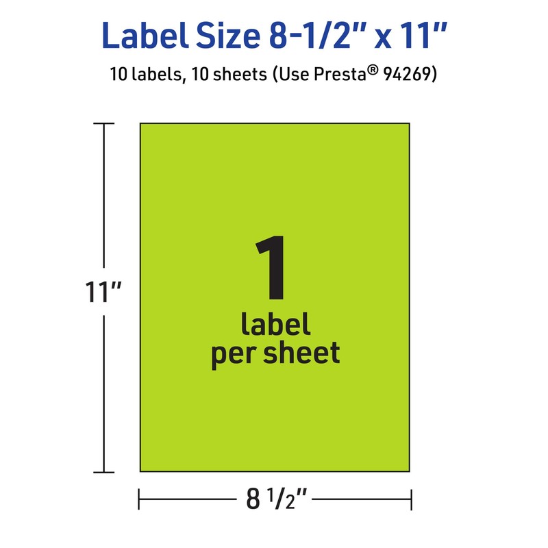 Avery Printable Sticker Paper, 8-1/2" x 11", Full-Sheet Labels, Bright Green Labels, Laser/Inkjet Printable, 10 Total, Great for Packaging and Stickers