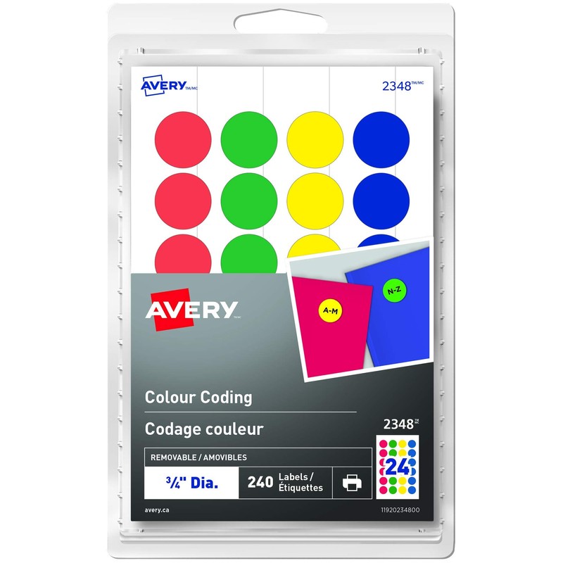 Avery Removable Colour Coding Round Labels, 3/4" Diameter, Assorted Blue, Green, Red, and Yellow Dots, Pack of 240 Labels (2348)