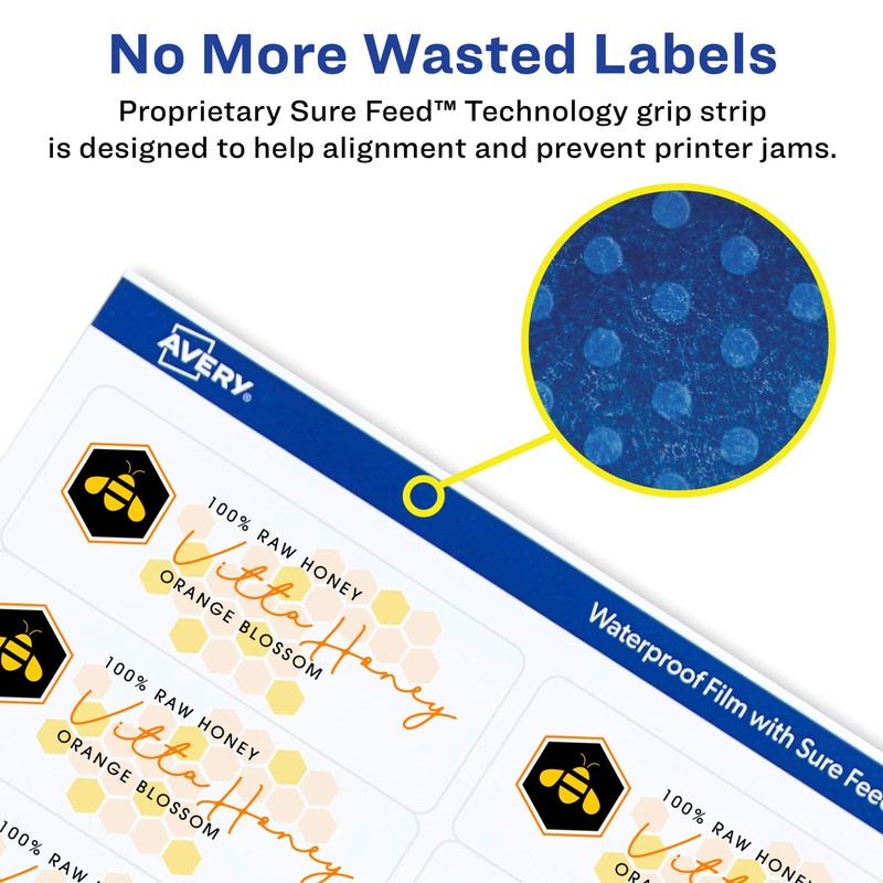 - Avery labels with proprietary Sure Feed technology provide a more reliable feed through your printer, preventing misalignments and jams