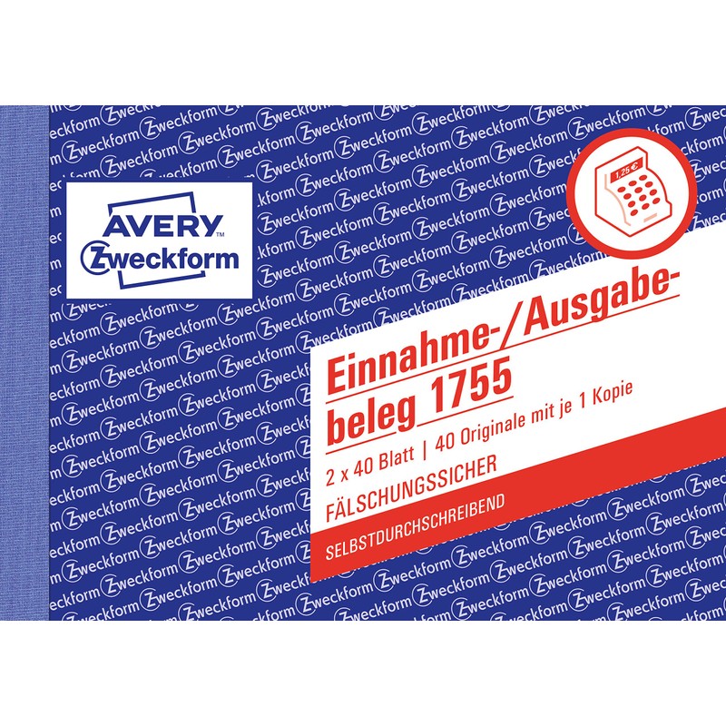 Avery Zweckform 1755 Einnahme/O Receipt A6 Landscape, Carbonless, 2 x 40 Sheets – White/Yellow