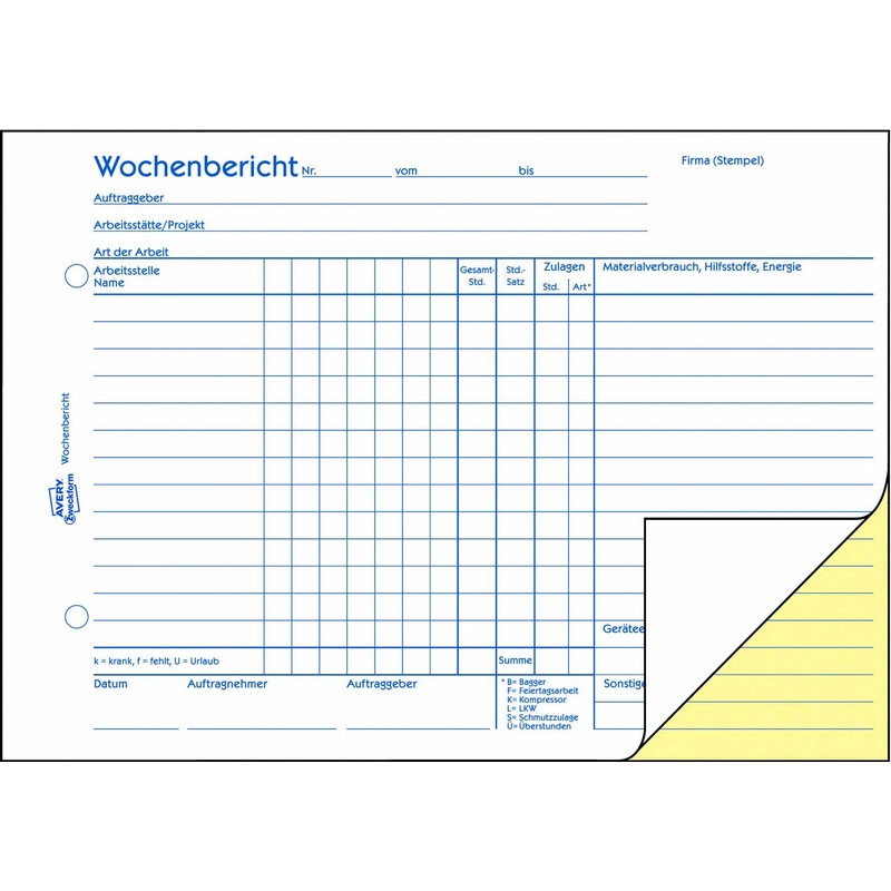 - The weekly report book by Avery Zweckform is vital on building sites and when travelling. The report/ management report is non-carbon paper, so the carbon copy is at hand