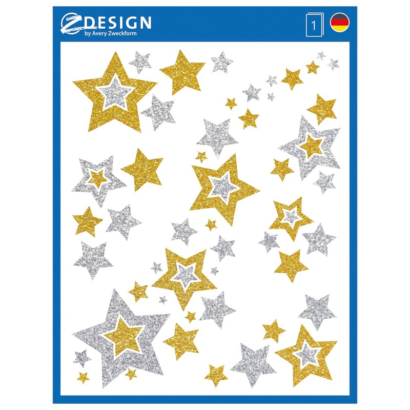 AVERY Zweckform 6 Fensterbilder Weihnachten Sterne gold/silber (Made in Germany, selbstklebende Fenstersticker, Weihnachtsdeko Fenster, Fensterfolie ablösbar, beglimmert) 1 Bogen/6 Aufkleber, 52952